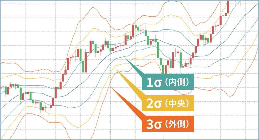 ボリンジャーバンドは移動平均線を挟んだ上下3本ずつの線で構成され、中心から外側にかけて、収まる範囲をσ(シグマ)と呼びます。具体的には、内側の1σに収まる可能性が約68%、真ん中の2σに収まる可能性が約95%、外側の3σに収まる可能性が約99%です。