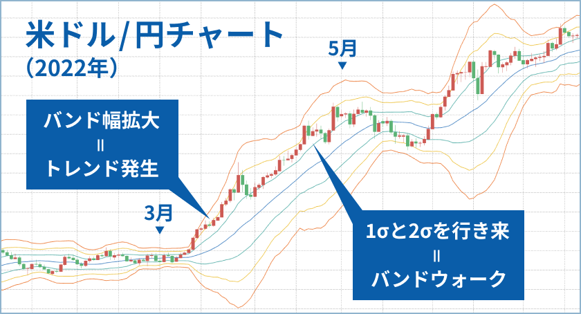 2022年3月、米ドル/円の価格が上昇し、+3σにタッチしたと同時に、バンドの幅が拡大しています。これがトレンド発生です。その後は、5月頃まで+1σと+2σの間を価格が行き来しながら上昇しています。これをバンドウォークと呼びます。2022年は大幅に円安ドル高が進行したため、複数回このバンドウォークが現れています。そして、再びバンド幅が縮小するとトレンド終了とみます。