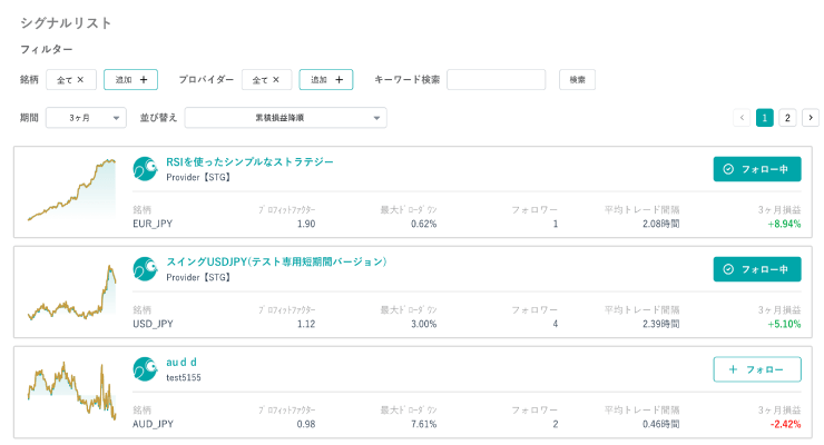 提供されている様々な戦略(ストラテジー)の中から、ご自身の投資方針に合うものをフォローするだけで、専門家のロジックに基づいた自動売買を開始できます。ストラテジーは順次追加予定です。