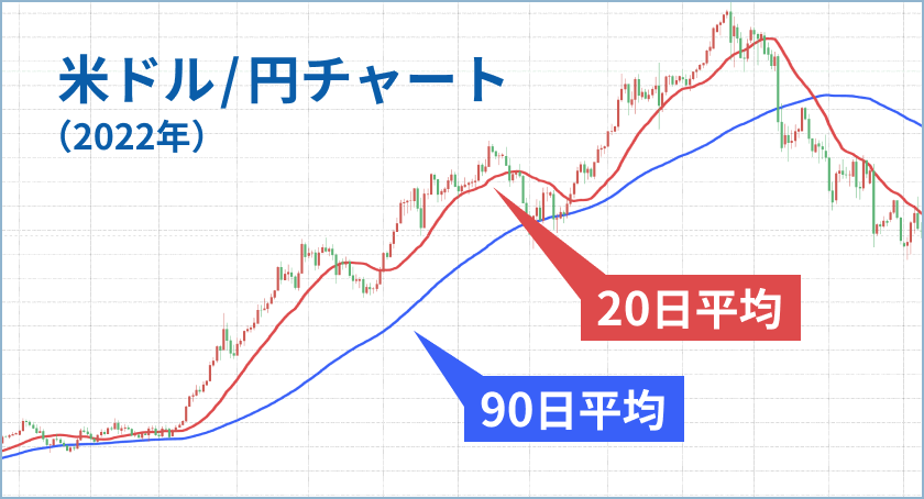 わかりやすいのは2022年の米ドル/円の値動きです。この年は日米間の金利差が拡大し続けたことがきっかけに、大幅な円安ドル高の年になりました。2022年の20日移動平均線と90日移動平均線を例に見てみましょう。