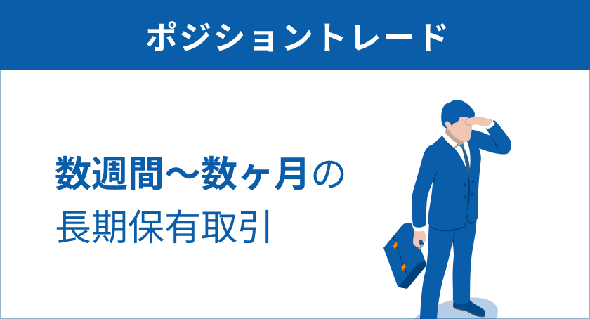 ポジショントレードは、数週間〜数ヶ月の長期間をかけて取引を行う手法です。一度の取引で得られる利益を大きくし、通貨ペアの金利差(スワップポイント)を利用した長期投資も可能です。